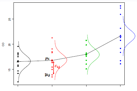 | Constante (μ ou β0) | Variable quanti | Variable Quali | Interaction quali -quali | |