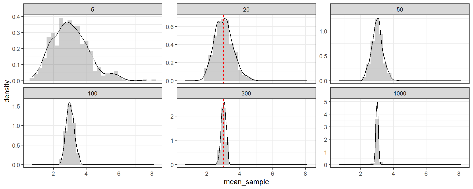 Mais dans la vraie vie, on aurait accès qu’à un échantillon de cette loi, par ex. de taille n=50. Regardons comment évolue la distribution des moyennes empiriques en fonction de la taille de l’échantillon.